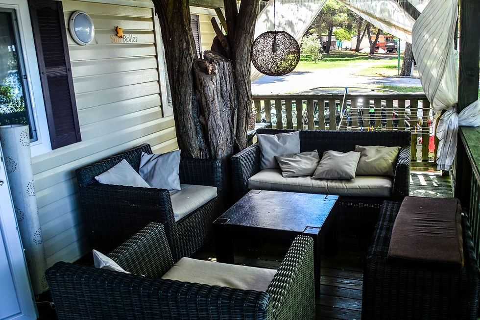 Apartmánový – mobilný domček /obytná plocha 24m2+ terasa 24m2 , 4+2 os. „možno viac“/ sa nachádza cca 20m od mora, pri pláži. Priamo z terasy je krásny výhľad na more, ktorá poskytuje dokonalý relax v tieni stromov. Domček má dve izby. Jedna izba je s manželskou posteľou. Druhá izba má dve oddelené postele+jednolôžko pre dieťa do cca 6r. Izbu možno doplniť aj cestovnou postieľkou do cca 3r. Ďalej domček obsahuje dennú miestnosť /s rozkladacím gaučom pre 2 os./ a kuchynskou linkou /so zariadením/, stôl + stoličky. Samozrejme v domčeku nechýba kúpeľňa so sprchovým kútom a toaletou. Pohodlie domčeka vytvára hlavne veľká terasa, ktorá je zariadená ratanovou sedacou súpravou, lampami, tv, veľkým jedálenský stolom a stoličkami.
